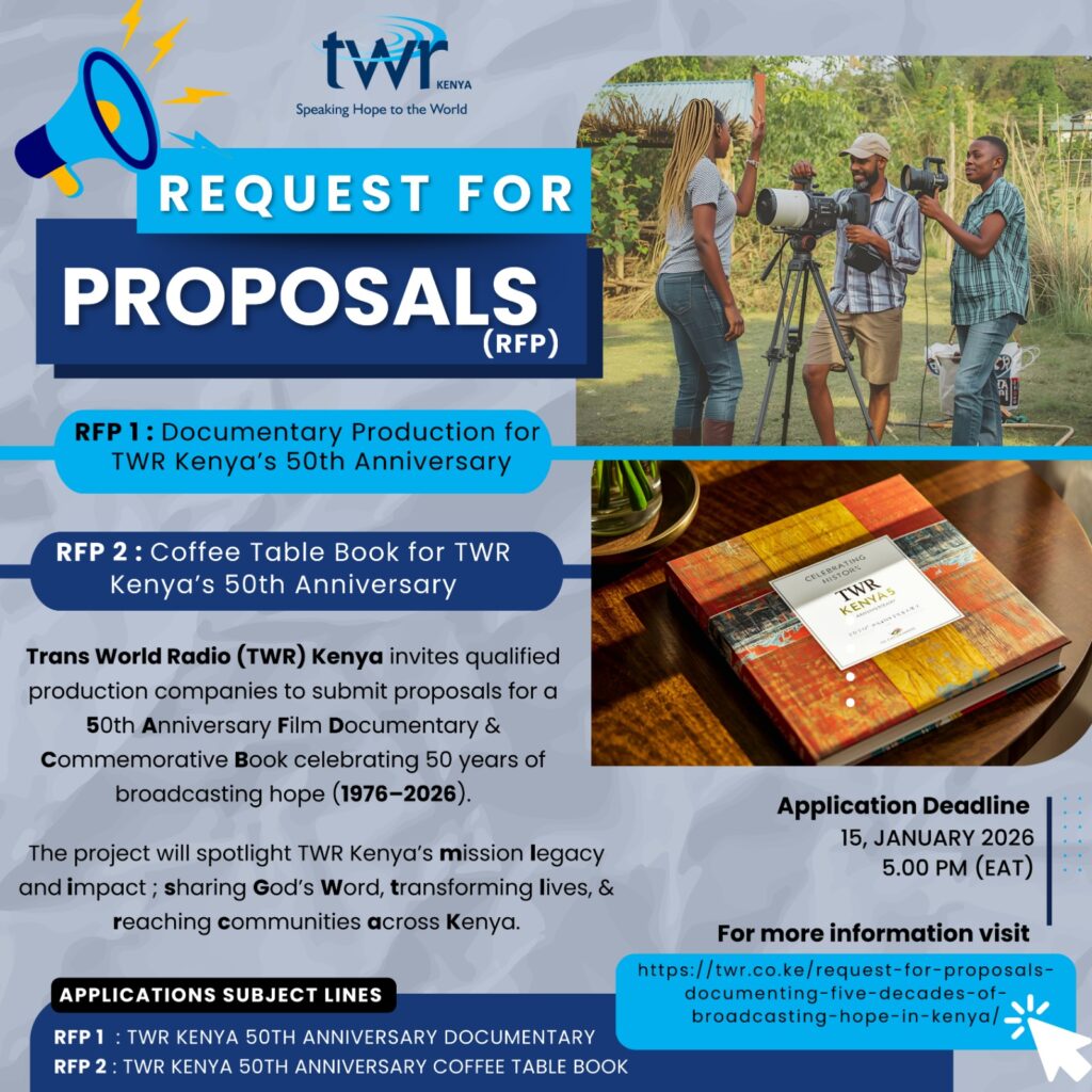 Trans World Radio (TWR) Kenya invites qualified and experienced production companies to submit proposals for the development and production of a documentary film to commemorate 50 years of broadcasting hope in Kenya.
