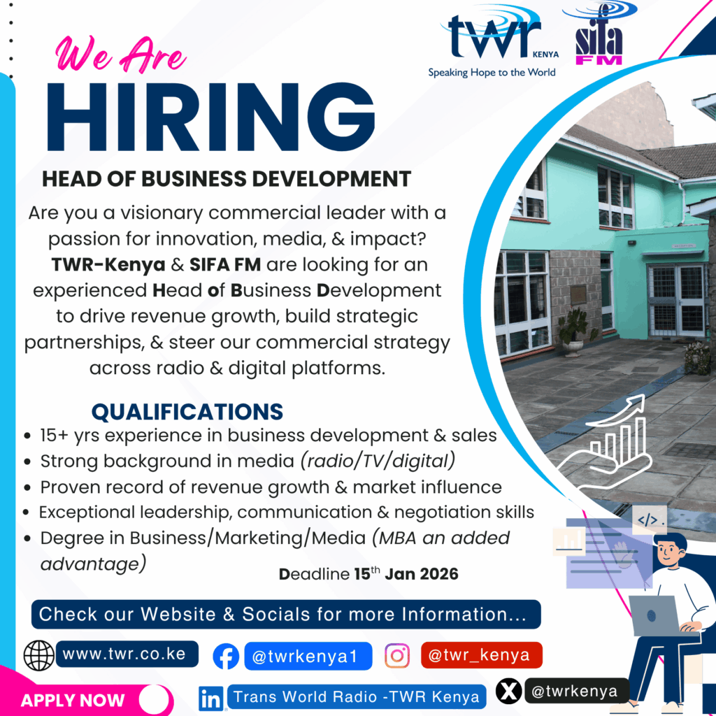 Trans World Radio Kenya (TWR-Kenya), in partnership with SIFA FM Stations, is seeking a dynamic, visionary, and commercially driven Head of Business Development to lead the organization’s revenue growth, strategic partnerships, and market expansion. This senior leadership role is ideal for a seasoned media and business development professional with a strong track record in driving performance, innovation, and growth.